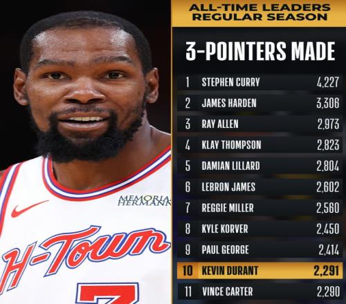 凯文-杜兰特在过去的三场比赛中连续鏖战122分钟拿到121分(连续三场30+),死神的镰刀不断挥舞而且对篮球的热爱不输任何人,此役首节杜皇命中一个三分球后历史三分命中数升至第十位,首节10分钟5中4拿到9分3助攻。