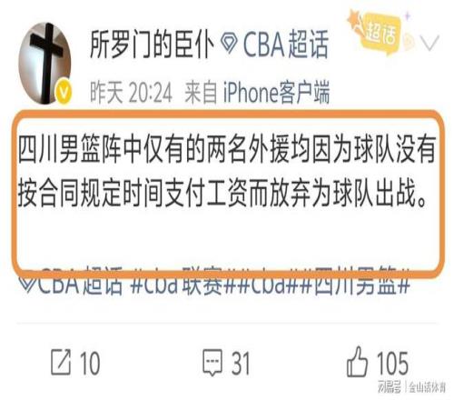 值得一提的是,本场比赛前,据媒体人“所罗门的臣仆”社媒发文爆料:四川男篮阵中仅有的两名外援均因为球队没有按合同规定时间支付工资而放弃为球队出战。”,随后,“所罗门的臣仆”又补充表示“两个外援目前还没见过工资。”。由于两名外援罢赛,四川队只能全华班出战,结果又是一场惨败。